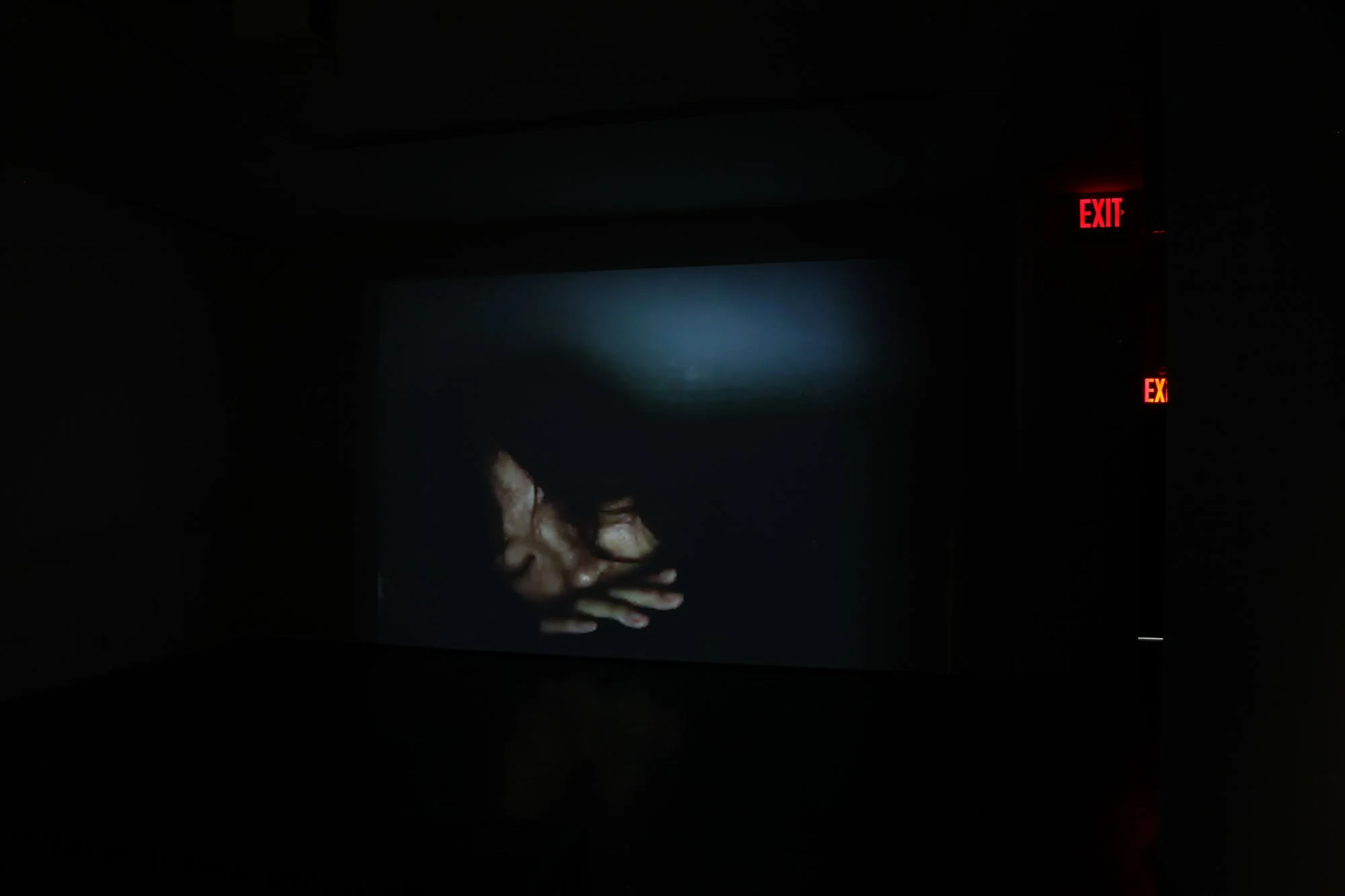 Filling a wall in the back of the gallery, the first video takes shape through thousands of low-resolution screenshots of the artist, mediated through a video chat window from the perspective of Yuan Yi, her late husband who passed away suddenly over a decade ago. Yuan obsessively documented their virtual intimacy in this way throughout the long-distance relationship the two shared. When seen on a single timeline, the rapidity and consistency of the images coalesce into a soft filmic narrative, capturing the longing across the temporal/geographic distances and the cursory nature of the communication medium. Vibrating with the poor image quality of screen grabs, now over a decade old, the subtle shifts in lighting and movement distribute broadly across exaggerated pixels. Sounds of the artist’s breath create the soundtrack, which is echoed in still moments when the artist sleeps or listens, where the only visible movement between frames is the subtle rise and fall of her chest. Yuan himself appears in blips—as both spectre and voyeur—where he occasionally grabbed an image of himself instead.